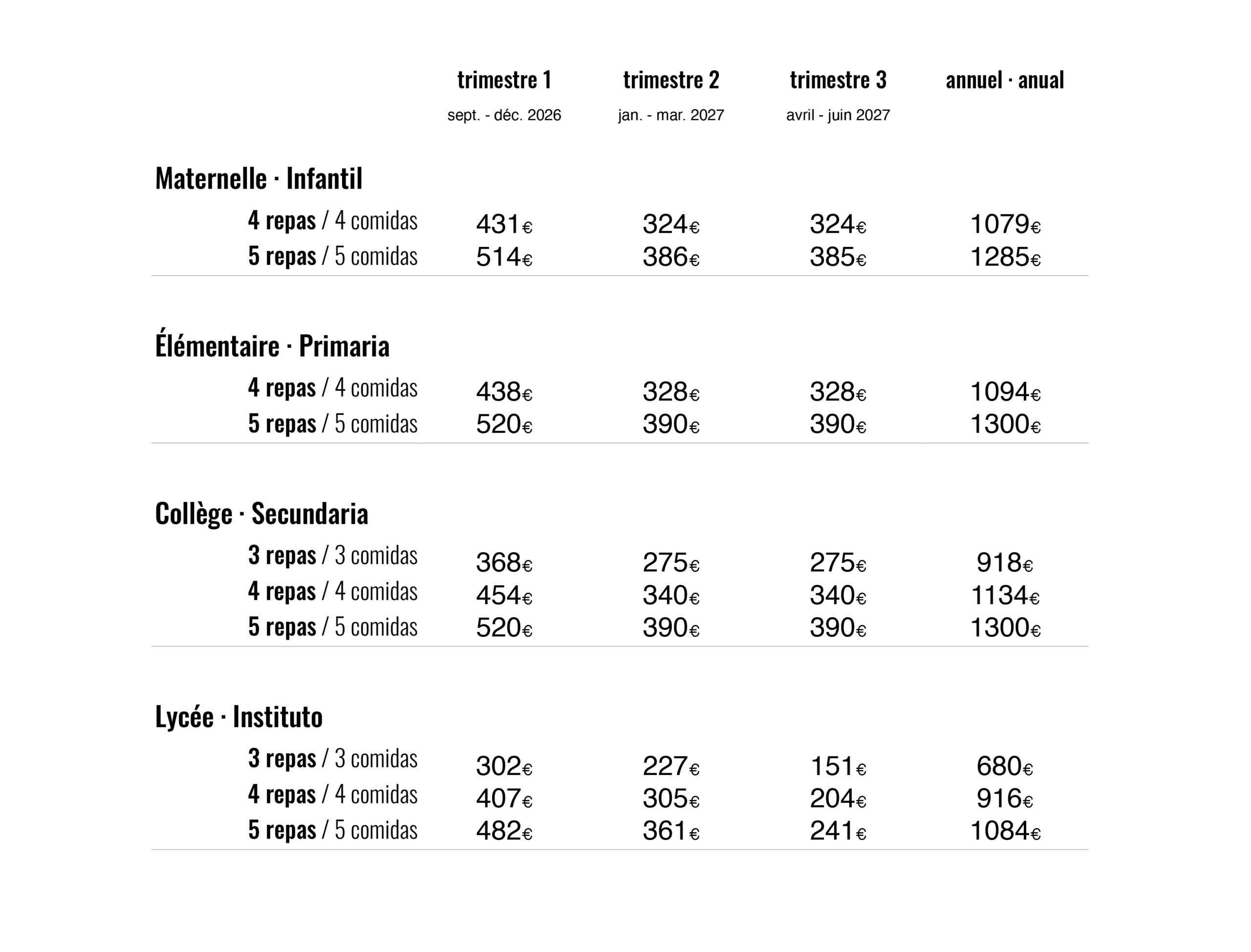 Tarifas de las comidas escolares · Tarifs de la restauration scolaire