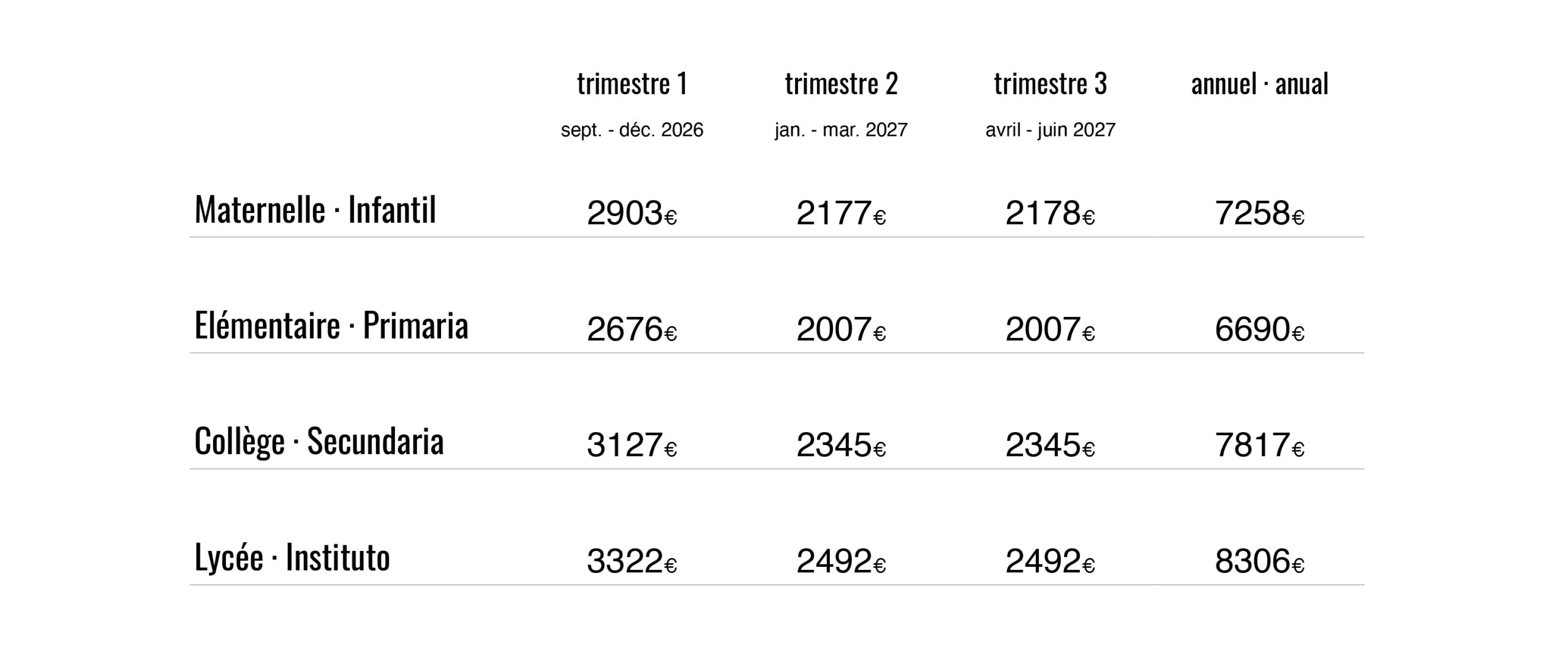 NB : las tarifas de la escuela maternal tienen en cuenta la « rentrée douceur » (vuelta al cole escalonada) en función del calendario escolar.